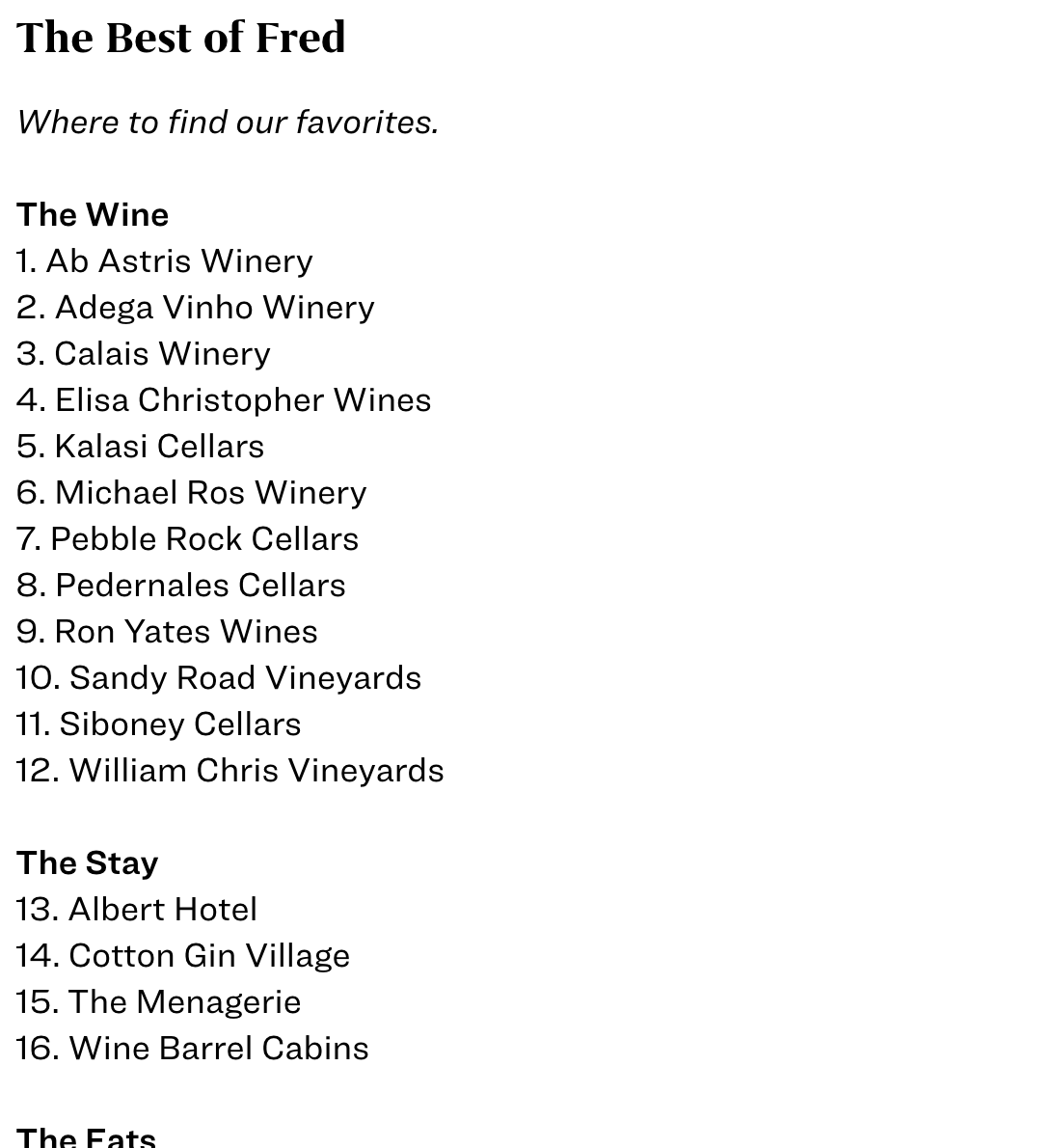 Expect to leave Fredericksburg with sunburned arms, an obliterated palate, and more than a case of bottles you can only get in the Hill Country. My haul contained wines from Ab Astris and Elisa Christopher along with a few other places I enjoyed, including Sandy Road Vineyards, Kalasi Cellars, Ron Yates Wines, and Pebble Rock Cellars.”